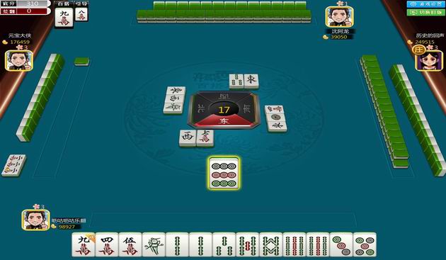 庄家 14张牌开打,每次打一张,其他三家按照逆时针顺序开打,每次打之前如果不出现吃,碰,杠,胡,则系统会自动摸牌。